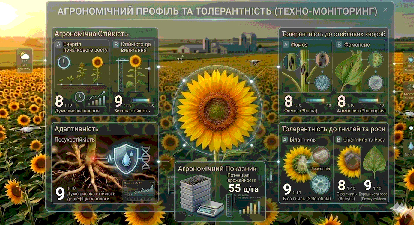 Енергія початкового росту-8 Стійкість до вилягання-9 Посухостійкість-9 Толерантність до фомозу-8 Толерантність до фомопсису-8 Толерантність до білої гнилі-9 Толерантність до сірої гнилі-8 Толерантність до борошнистої роси-9