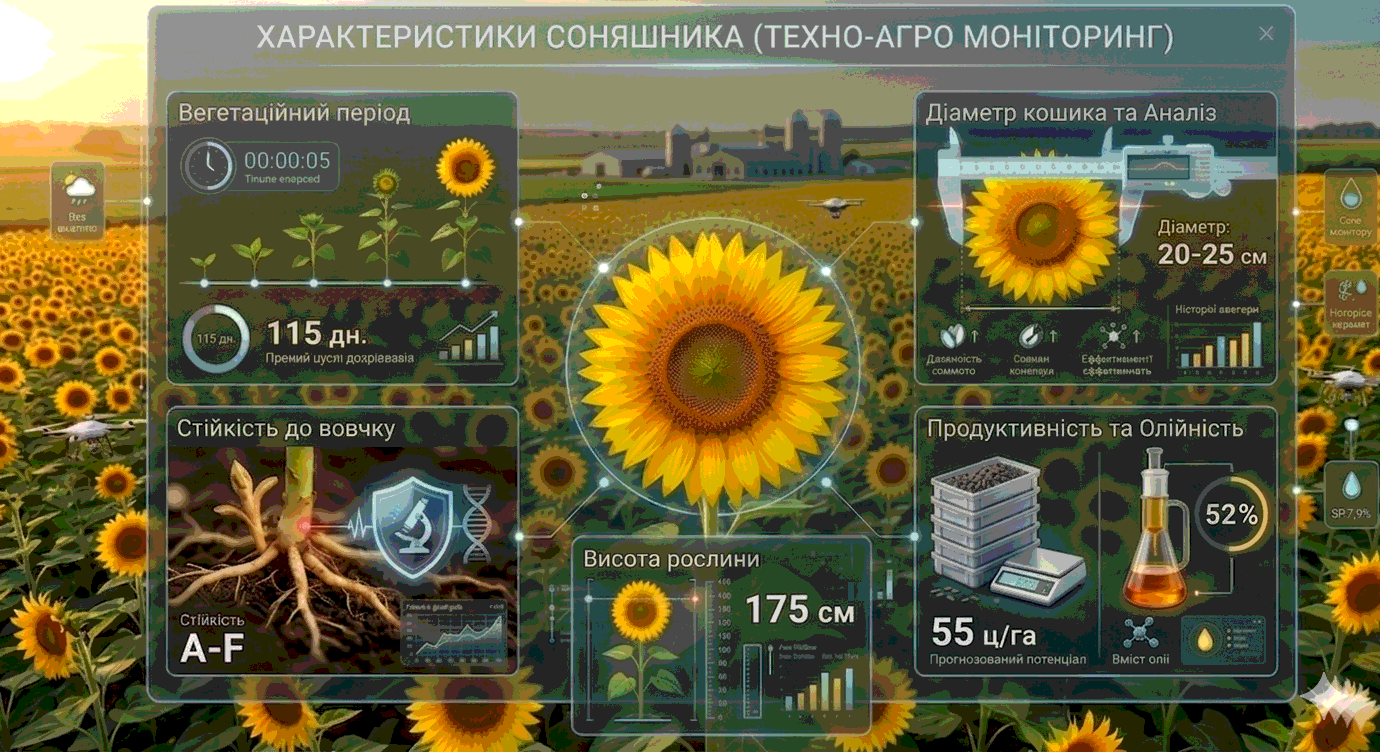 Вегетаційний період: 115 дн. Стійкість до вовчку: A-F Висота рослини: 175 см Діаметр кошика: 20-25 см Олійність: 52% Потенціал врожайності: 55 ц/га