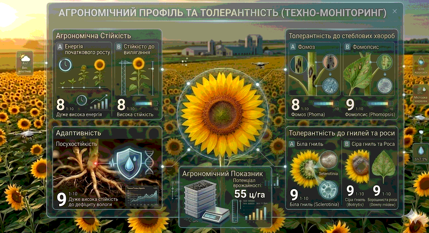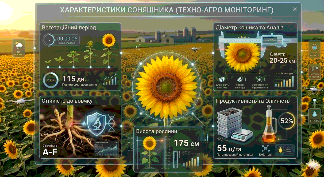 Вегетаційний період: 115 дн. Стійкість до вовчку: A-F Висота рослини: 175 см Діаметр кошика: 20-25 см Олійність: 52% Потенціал врожайності: 55 ц/га